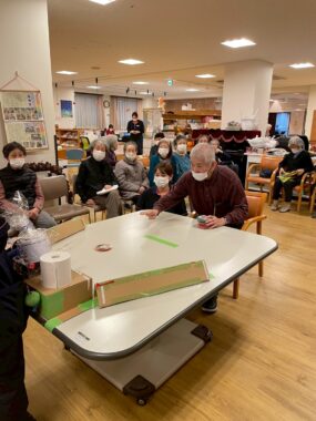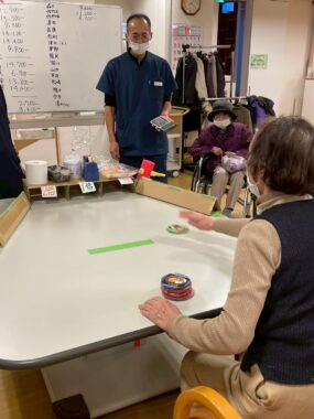 食後のレクリエーションでは「テーブルシューティング」で楽しく運動をしました。