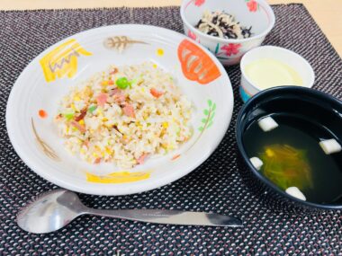 9/29 誕生日メニュー 《 グリルポークの炒飯、はんぺんと貝割大根のすまし汁、 ひじきと切干大根のサラダ、豆乳プリン 》 炒飯は彩り良く野菜やハムを入れ、見た目も華やかに仕上げました デザートの豆乳プリンは舌触りがなめらかで、利用者様からも『美味しい!!』 と笑顔が見られました 2025.09.30(火) アンダンテ