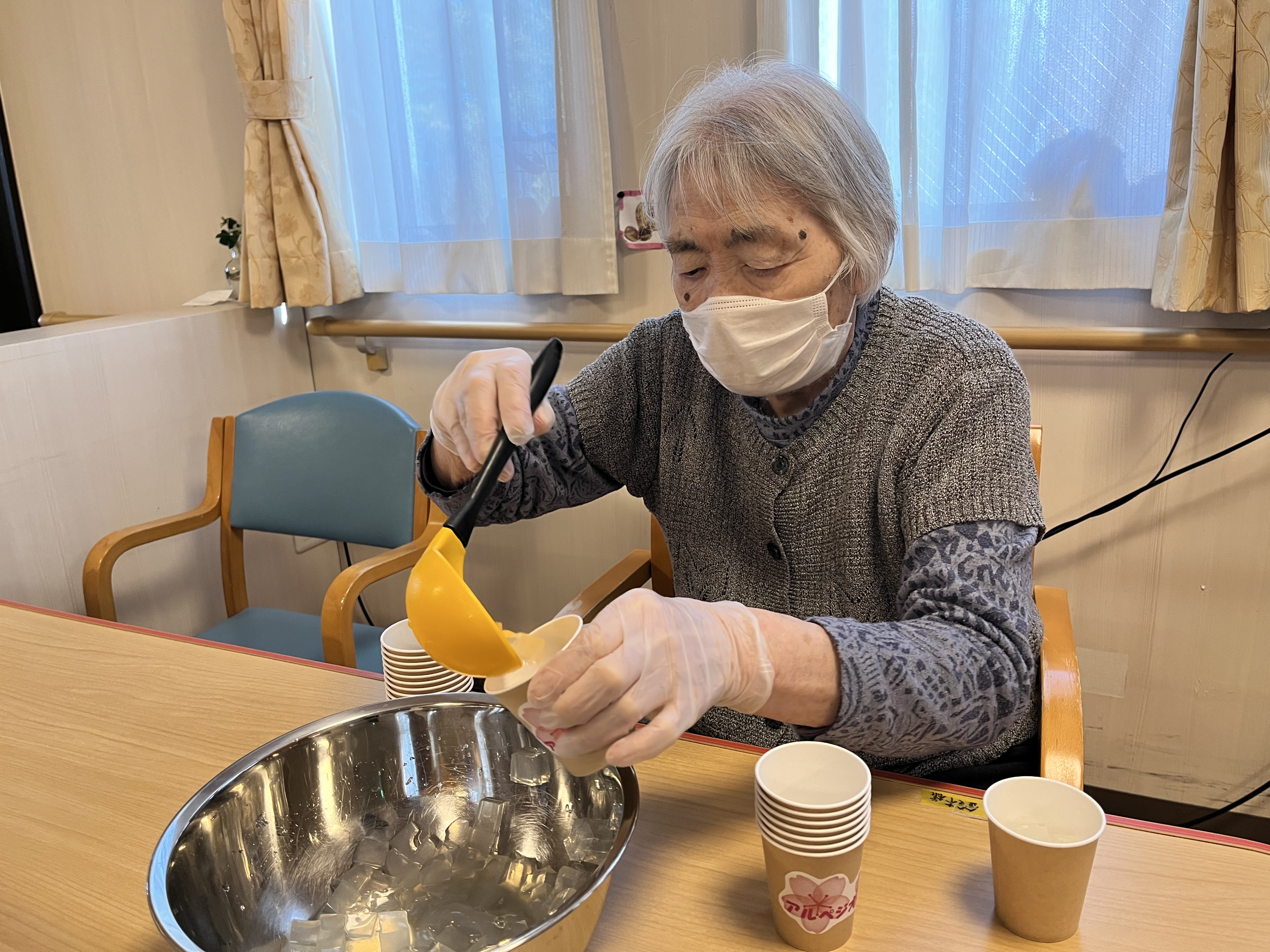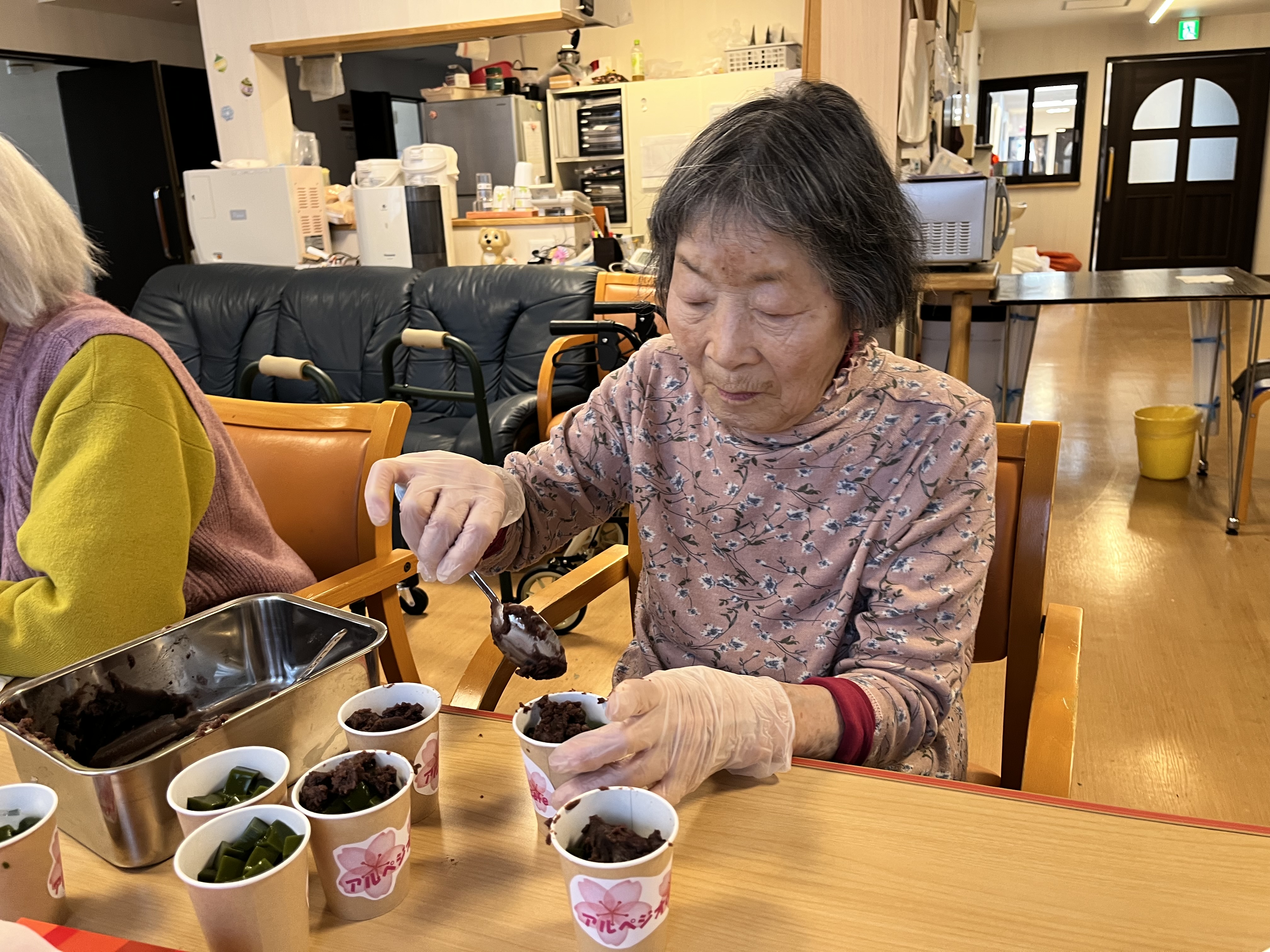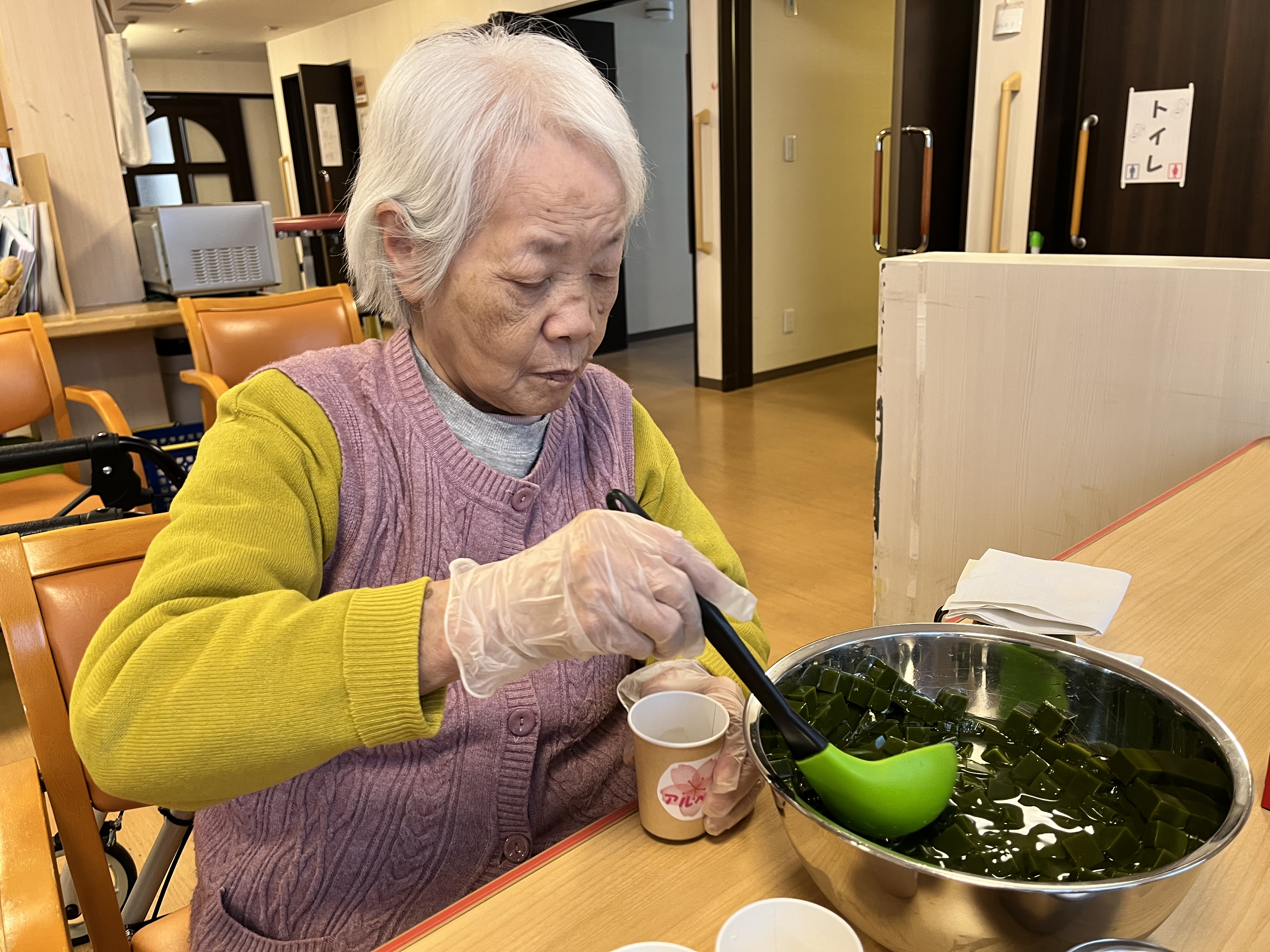 寒天ゼリー、抹茶寒天、あんこやクリームの盛り付けを利用者様にも手伝っていただき、和やかな雰囲気で作業が進んでいきました。