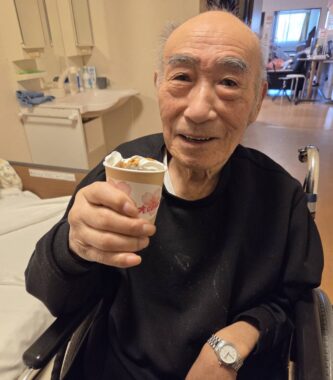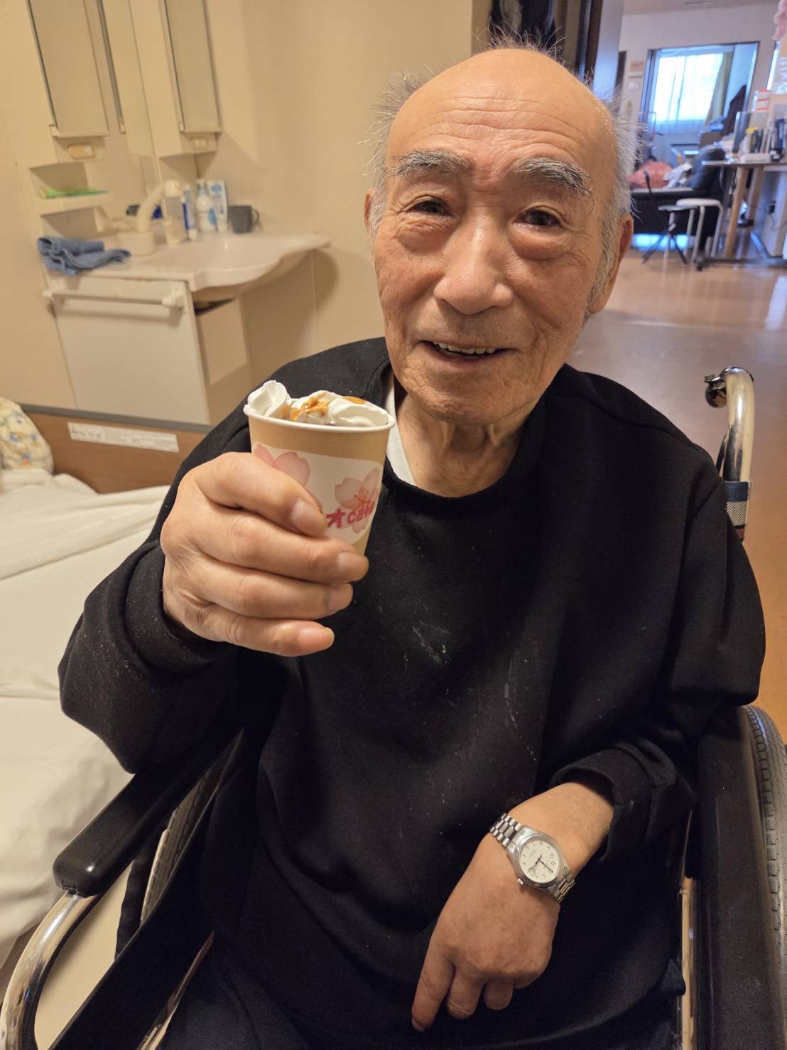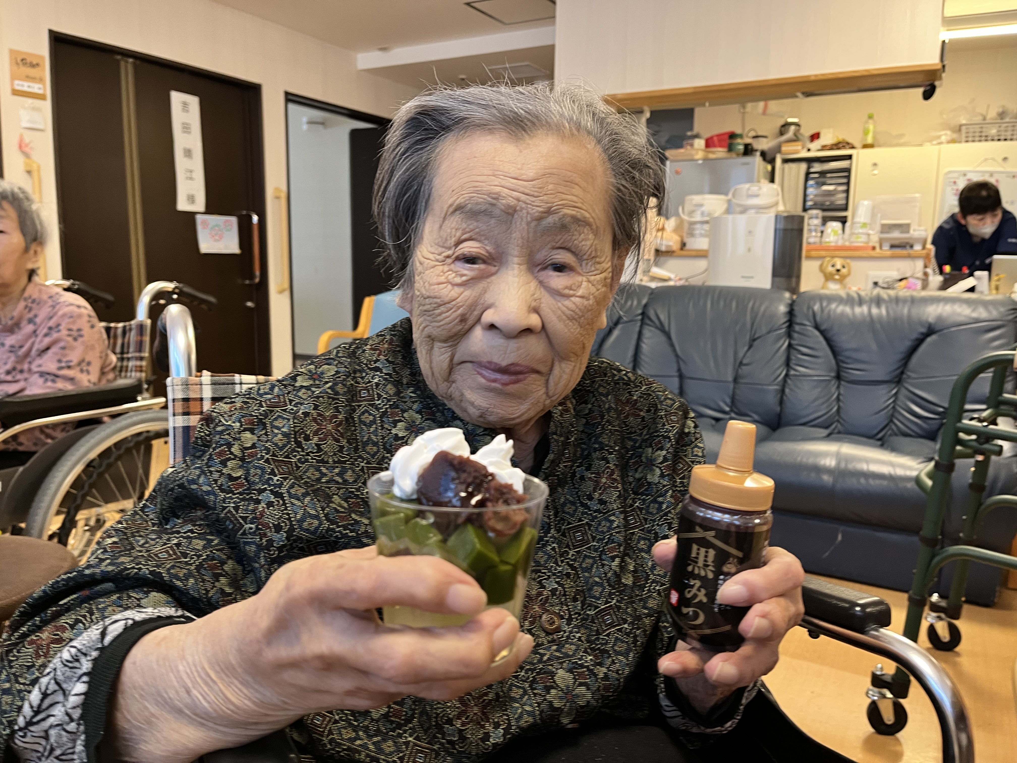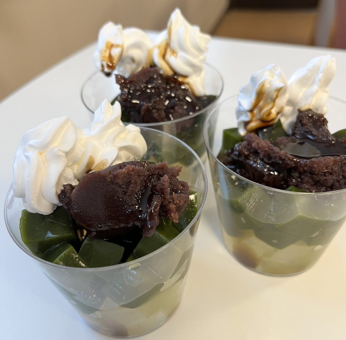 出来上がった抹茶あんみつは「おいしいよ、あんこは特に好きなんだ」と喜んでいただけました!