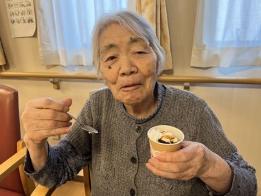 おやつレクで抹茶寒天とあんこで抹茶あんみつを提供しました。