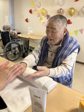 いい香りのハンドクリームとマッサージで気持ちよくうとうとされたり「いや~気持ちいい」とリラックスできたようです。