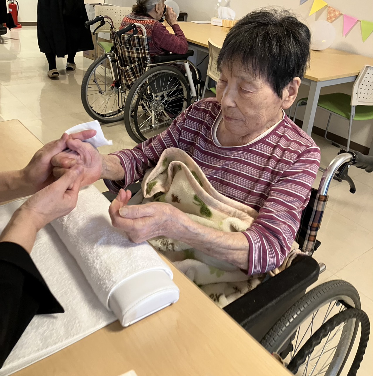 いい香りのハンドクリームとマッサージで気持ちよくうとうとされたり「いや~気持ちいい」とリラックスできたようです。