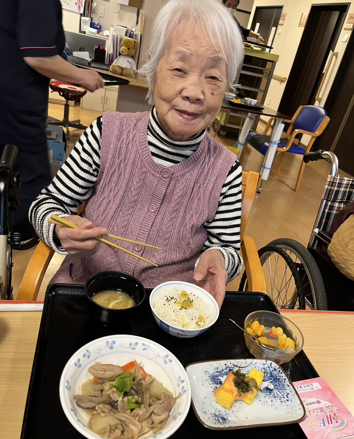 さつま芋ごはん 博多がめ煮 厚焼き玉子明太ソースかけ すいとん風 フルーツあんみつ です。