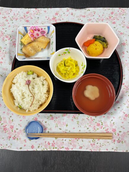 4月8日の昼食には春の訪れを楽しんでいただくために 「お花見御膳」 をご提供しました。メニューは桜と枝豆のご飯、魚の柚子焼き、しんじょうの煮物、沢庵としらすのごまサラダ、すまし汁です。