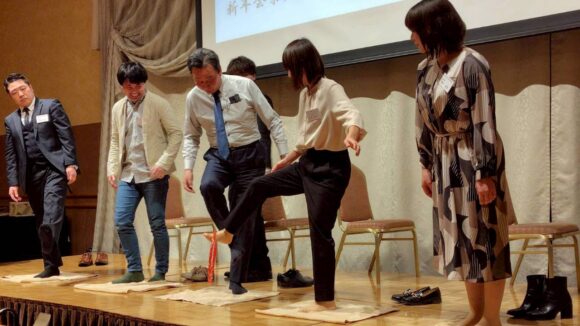 余興の時間には、テーブル対抗の「体幹ゲーム(ワンフットリングリレー)」を開催![]()